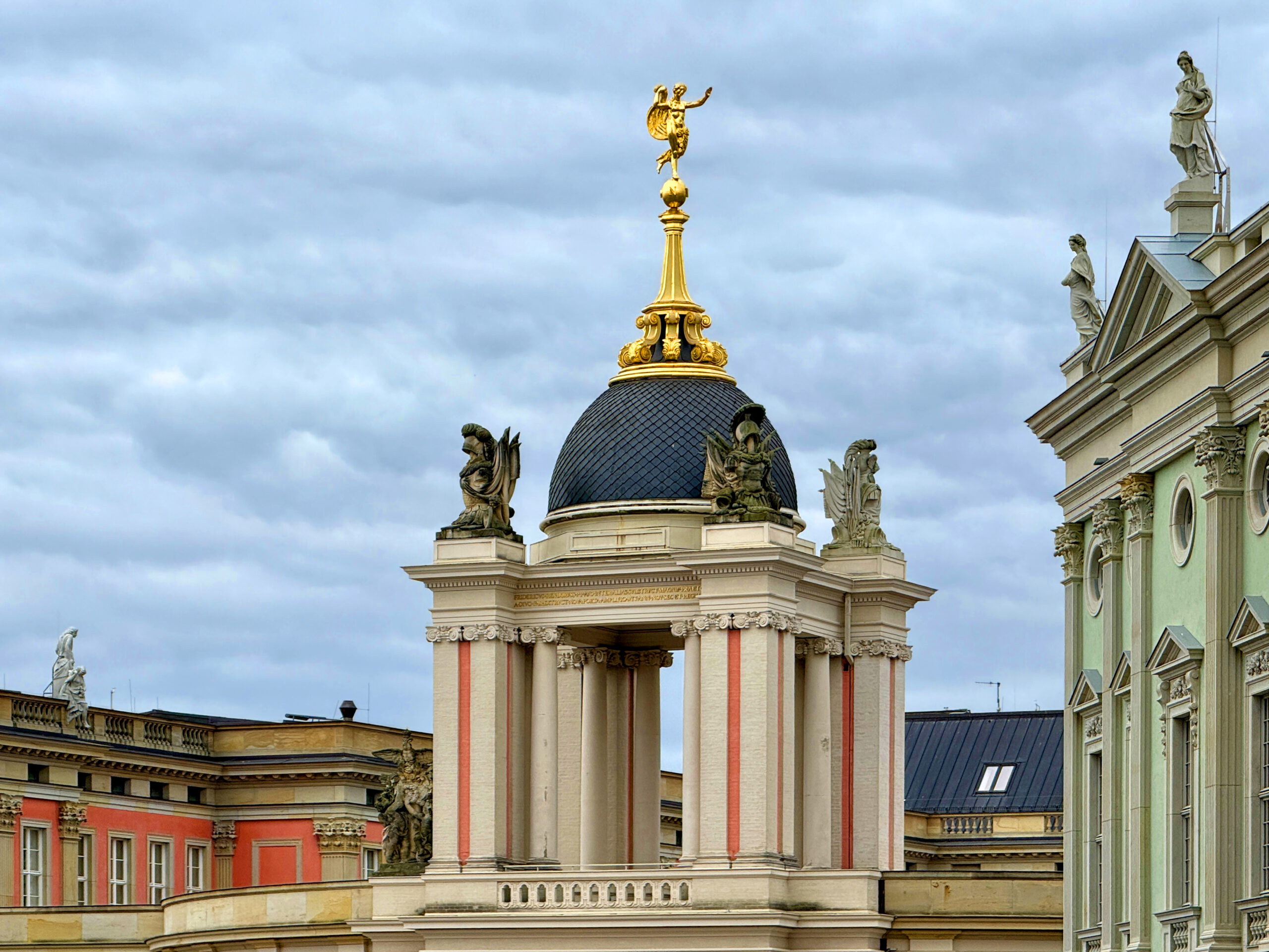Die historische Fassade Knobelsdorffs wirkt aber erst vollständig mit dem vielgestaltigen Figurenschmucks des Rokokos, der dem Stadtschloß seine Leichtigkeit und Verspieltheit verleiht. Erst mit der kompletten Wiederherstellung des Skulpturenschmuckes werden quasi der Parnass, der antike Sitz der Künste und der Götter und Helden, über dem Alten Markt wieder ihre alte unverwechselbare Wirkung entfalten können. Denn die Attikafiguren aller Bauten am Alten Markt beziehen sich aufeinander. Diese Skulpturen stellen mit ihren Proportionen, mit ihren Bewegungen und Gesten den Bezug zu den Menschen, zu den Passanten und Besuchern her.